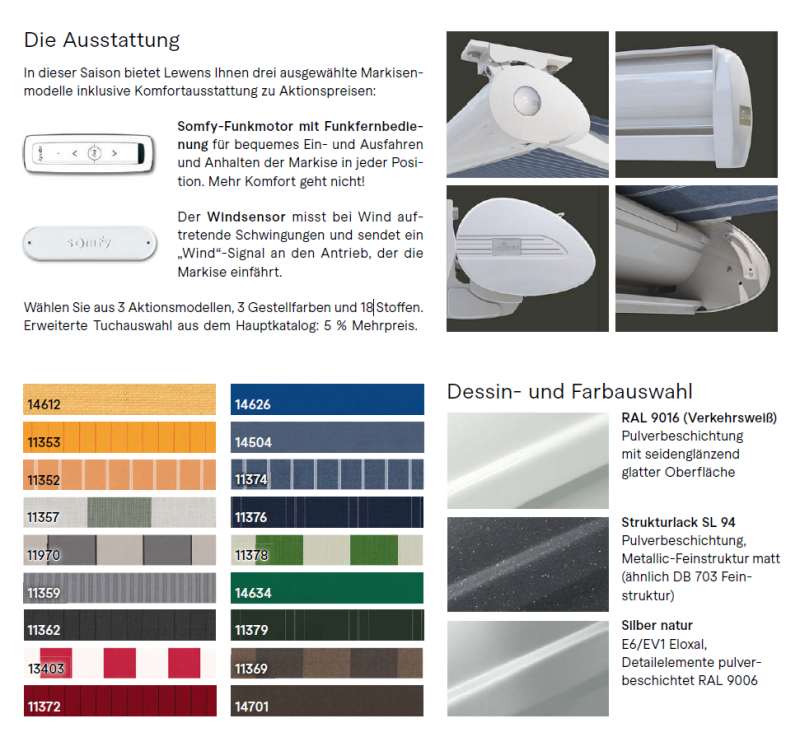 Auswahl aus 18 Marken Acryl-Stoffen. Falls Stoffauswahl aus der gesamten Stoff-Kollektion Aufpreis + 5% der Markise